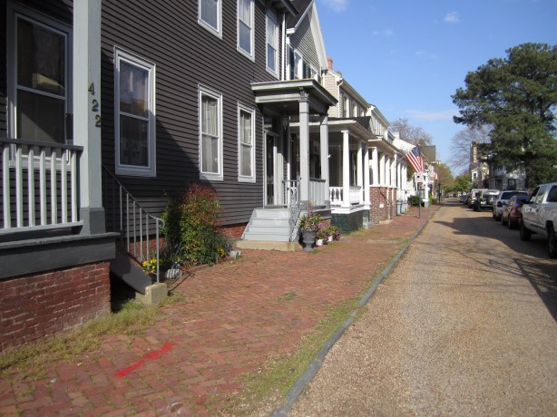 I parked the car in downtown just across the tunnel from Norfolk. There were lots of parking spaces. Like Broad Street in Richmond, or (I have heard) Woodward Avenue in Detroit, everything in Portsmouth seems to permeate from one street, which is High Street. It is the main shopping street of downtown and it goes out to the furthest suburbs. The commercial part of downtown Portsmouth is predictably dead, with a few spots of life. There are a few bars and restaurants, there are the typical museums brought in by the government try to prop things up. The Commodore Theater, a movie theater, is amazingly still up and running. But eighty percent of the storefronts are empty. Surrounding downtown on the north side in Olde Towne. Despite the pretentious spelling probably instituted in the nineteen seventies, Olde Towne is really old, and except for the lack of commercial life, really a town. Lots of houses are built before 1800, and most of it is before the Civil War. For Hampton Roads, it is the oldest, and really only intact neighborhood of its kind. You can walk down to the water’s edge and look out over the Elizabeth River to downtown Norfolk, less than half a mile away. There are several very narrow streets with eighteenth century buildings.