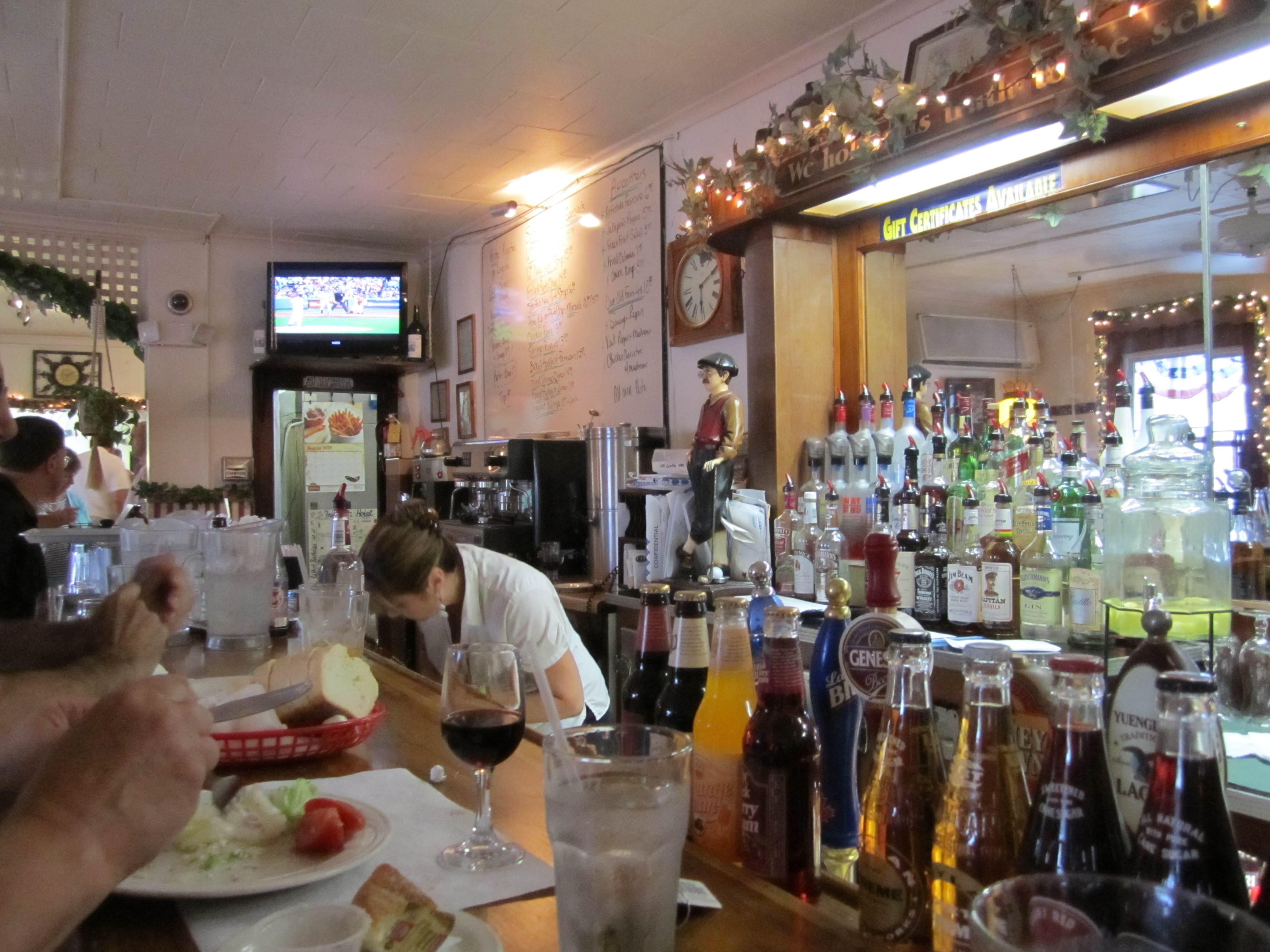 Unlike the dark basement feel of the Happen Inn, the Franklin Hotel is Rome NY is above ground and brightly lit. It is apparently no longer a hotel, but a popular small Italian restaurant. On this Saturday night, it looked like the interior of places we had known in New Orleans; formica tables without tablecloths, old guys (now including me) sitting at the bar eating fattening Italian food. On the iceberg lettuce salad that came with the pasta and chicken entree, there was a memorable vinagrette dressing. This place shows that no matter depressing Rome NY seems, if you look hard enough you can find a soulful place.