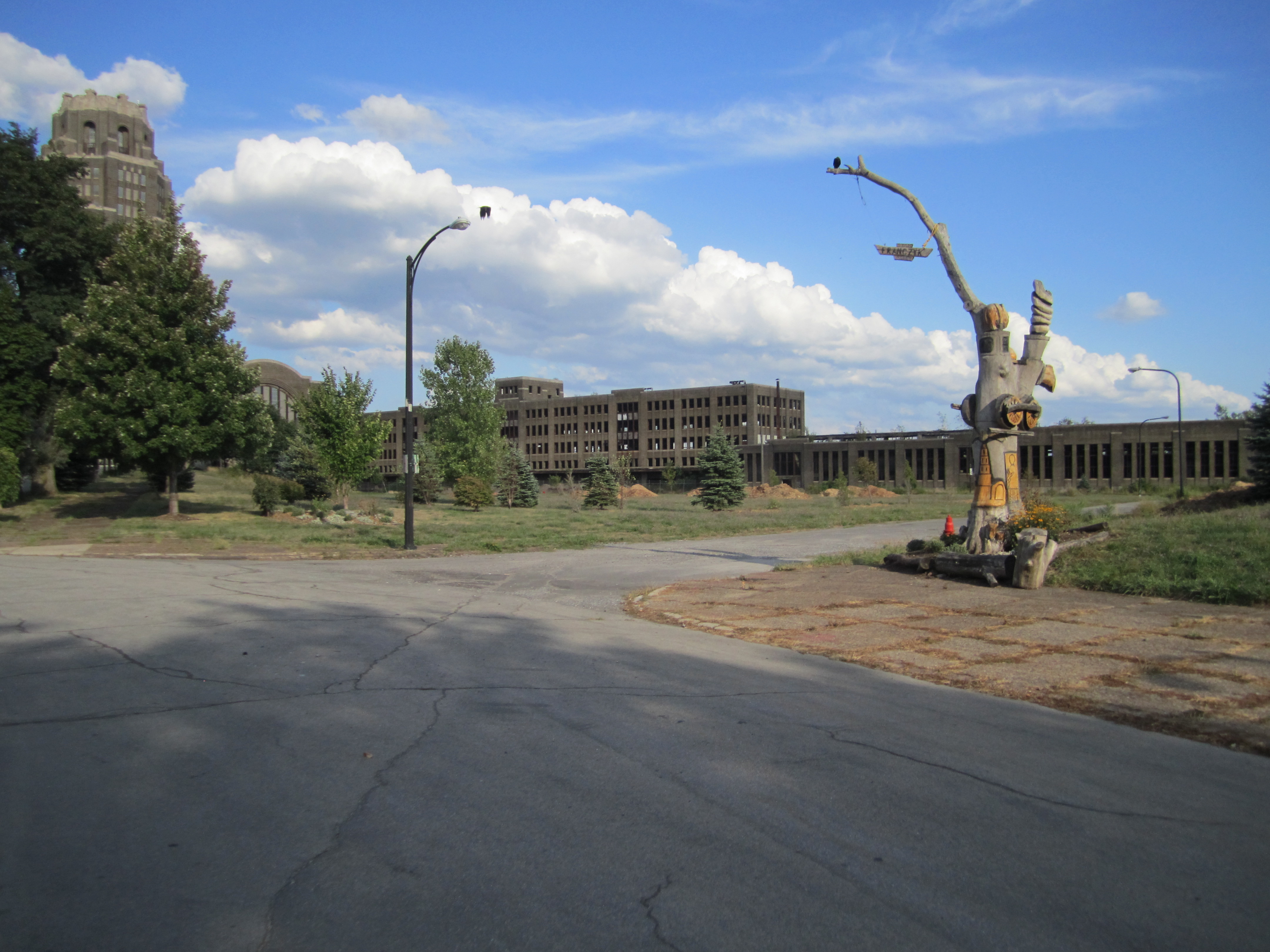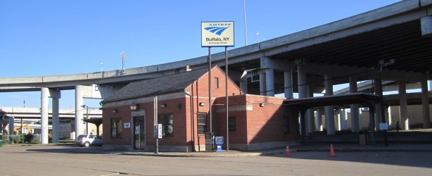 Buffalo Central Station sits three miles from downtown, in a direction it appears few people ever go. The side of Buffalo most people visit, the North and West side, is full of leafy neighborhoods, bars and restaurants; even Frank Lloyd Wright houses! Go to downtown, which is somewhat depressing, and then turn the other direction, south and east down Broadway, and you enter another dimension. The street ceases almost immediately to have buildings alongside it; it is like entering the countryside right next to downtown. Redevelopment has torn down most of the buildings but replaced very few. There are very scattered newer suburban style houses, mixed with the odd preserved iconic building, sitting by itself in a field. There were one or two prominent Catholic churches, sitting abandoned; fenced in for preservation. Young men in oversize white tee shirts loitered around on the corners. Lyman and I rode quite briskly at about six PM through this somewhat threatening scene, occasionally having to stop and check the map on my I-Phone.