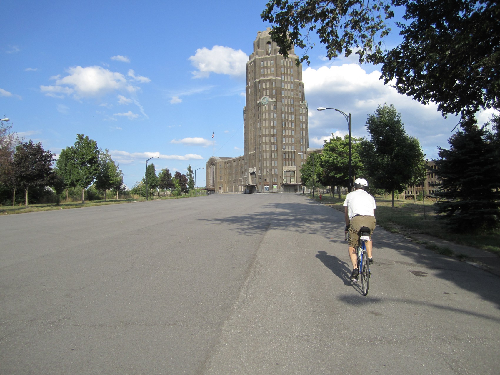We finally did arrive at our planned destination. Central Station sits forlornly by itself at the end of a wide dead end street with no cars, overlooking some slums. The empty office tower is seventeen stories. The empty central waiting room was said to rival places like Grand Central Station in New York City. Buffalo Central Station was built to process 3200 passengers per hour. It was put in this remote location because it was thought that the rapidly growing Buffalo of 1927 would catch up to it. The current citizens of Buffalo have done a good job of raising enough money to at least lock the building, to prevent further vandalism. They sometimes even use its central hall for things like parties and art shows. It is large enough to have a regulation hockey game on the central floor. But the building this day was locked, so all we could do was circle around it on the bikes.