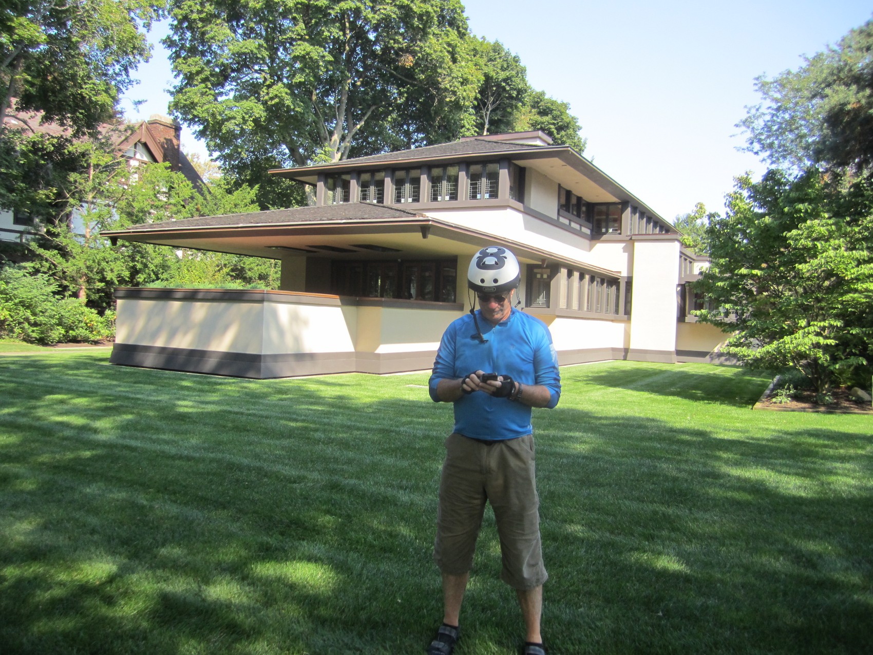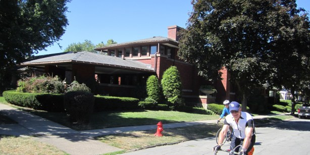 There are at least six Frank Lloyd Wright buildings in Buffalo proper, and Lyman and I rode around to see some of them on Monday. We saw an additional house in Rochester three days later. These are all Prairie School buildings, from his 1900-1910 phase. Lyman the architect described how Wright pushed the feasibility envelope on his cantilevered designs; he said most owners have had replace the the original wood support beams with steel, in order to keep the houses from falling down. These houses were stuck like curious gems into neighborhoods of otherwise conventional rich people’s houses of the same era.