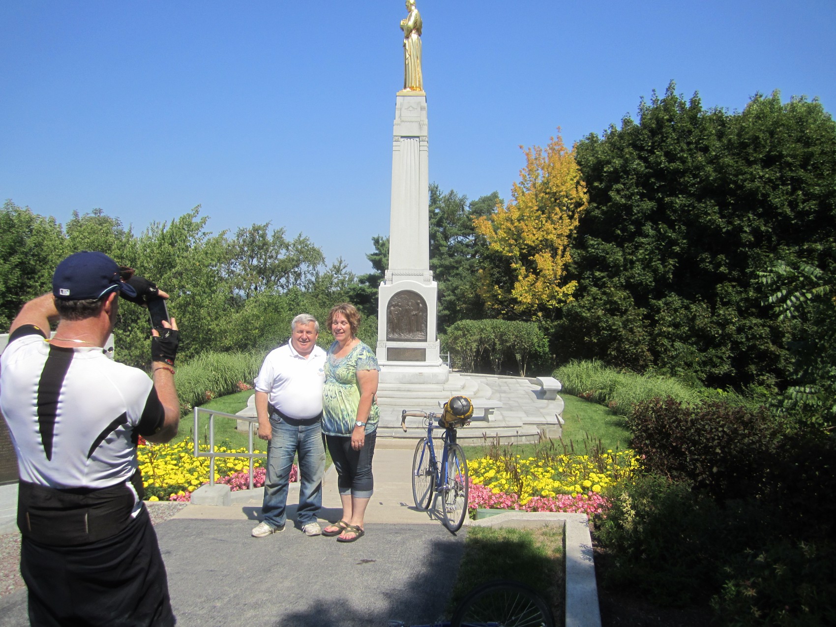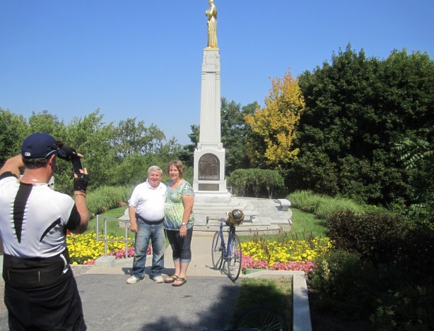 It was a hot day, but we could not be prevented from searching further for Mormon sites. We cycled to a large temple about five miles out of town, but skipped visiting that and the Smith farm, (although we did use the restrooms there!). We instead pedalled up a large hill to the prominent statue that commemorates the arrival of the angel Moroni. Some friendly Utah visitors corrected our pronunciation of the name of the angel, which is pronounced mo-ro-NY. Steve took their picture for them in front of the statue.