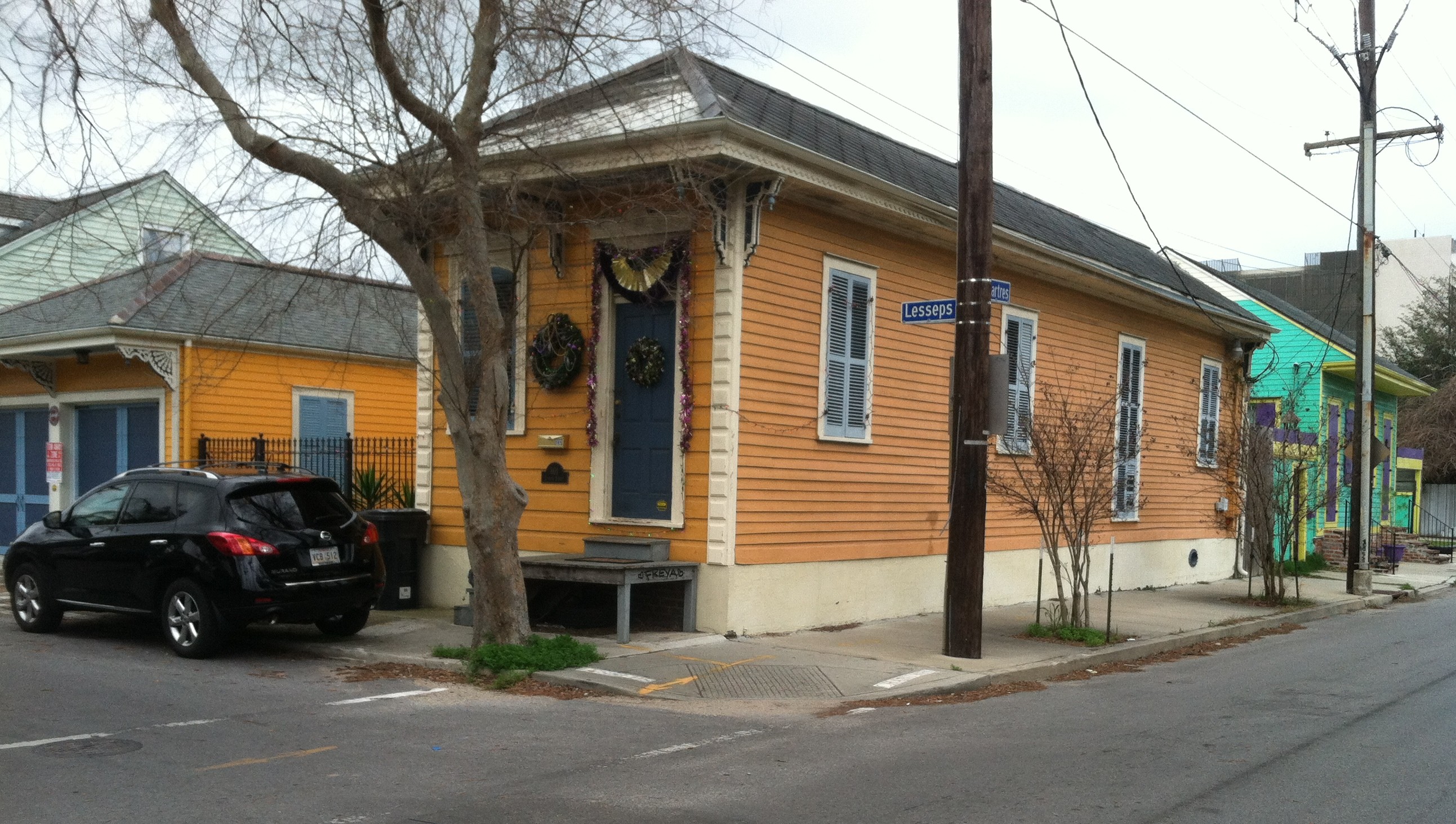Saturday before Mardi Gras I rode by myself through Bywater, downriver from the French Quarter and Fauborg Marigny, but upriver from the much publicized Lower Ninth Ward. Bywater, also called the Upper Ninth Ward, is easily the coolest place in America right now. Iit is a mixed working class neighborhood, with artists and hipsters from all over the country moving there. There were all sorts of impromptu Mardi Gras parades and celebrations going on.