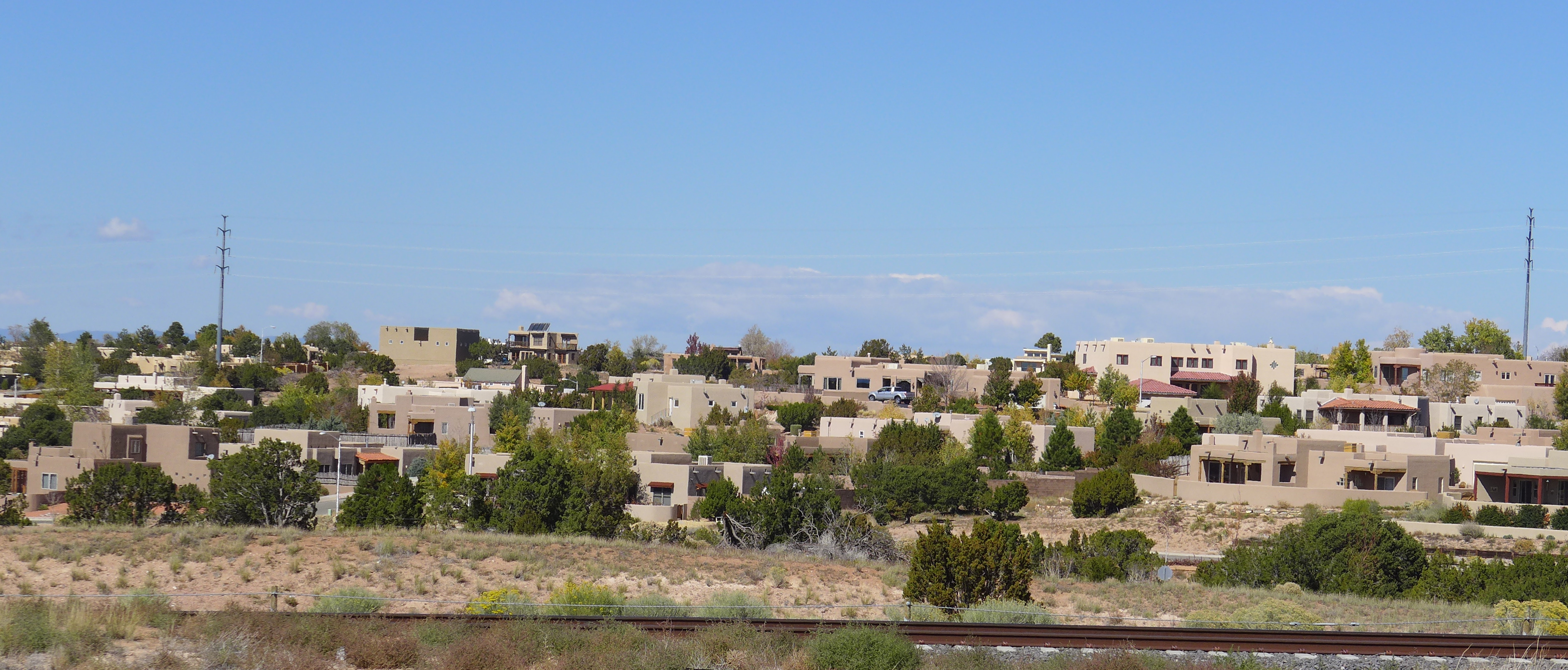 Later that day we drove back to our Hampton Inn in Santa Fe, and prepared for the bike ride from Santa Fe to Albuquerque, to be done in two days by a back road. Leaving Santa Fe, we passed through its suburbs. Santa Fe has a very strict building code, everything has to be built to look like it is made of adobe.