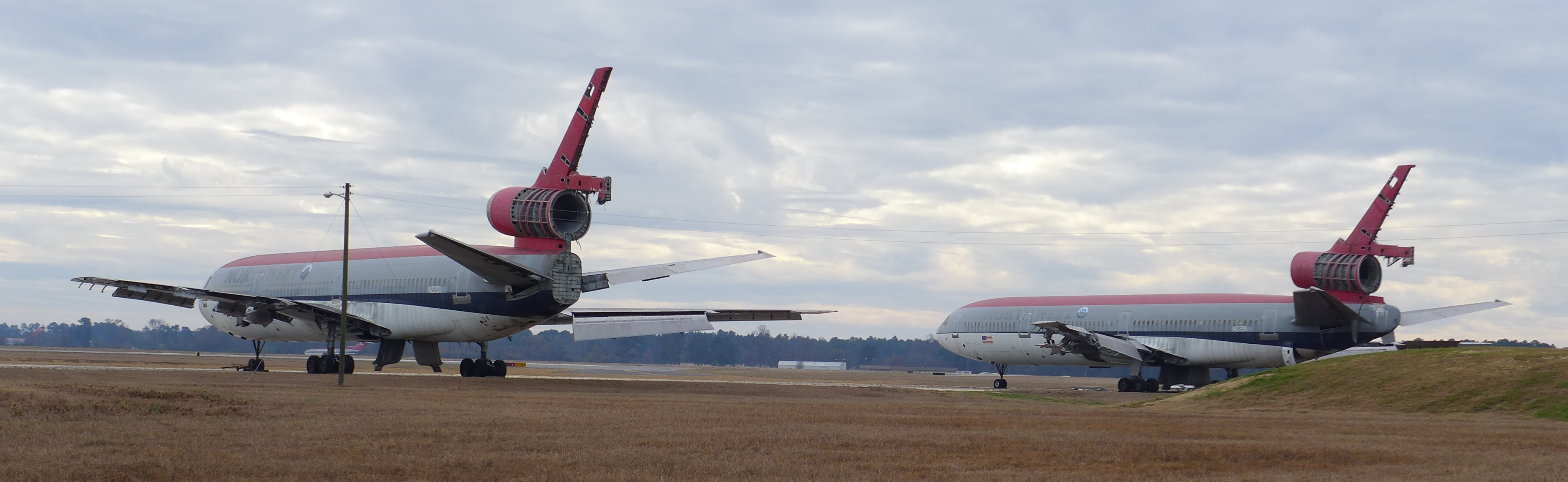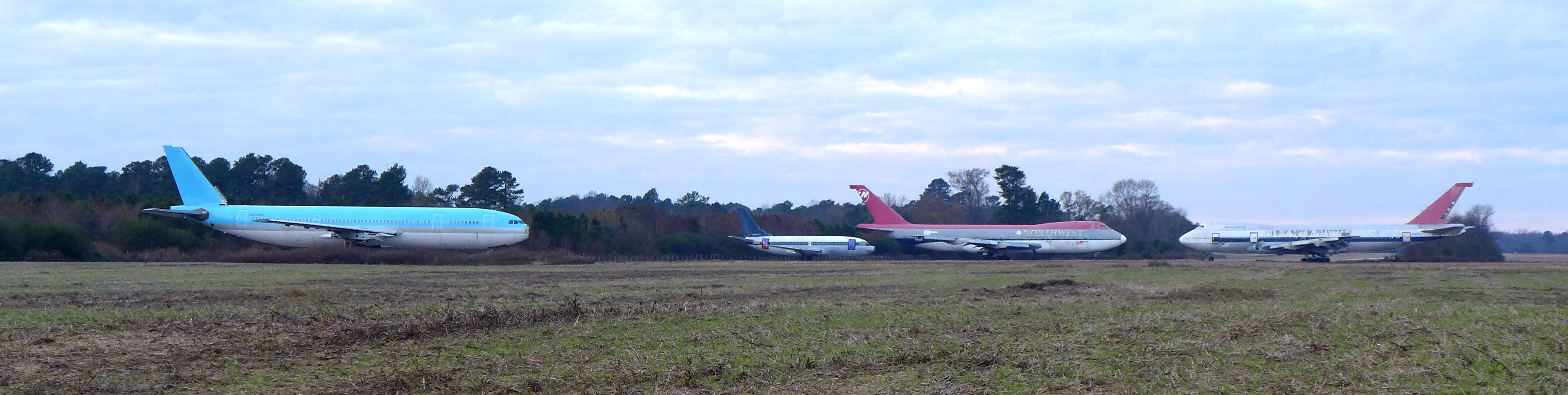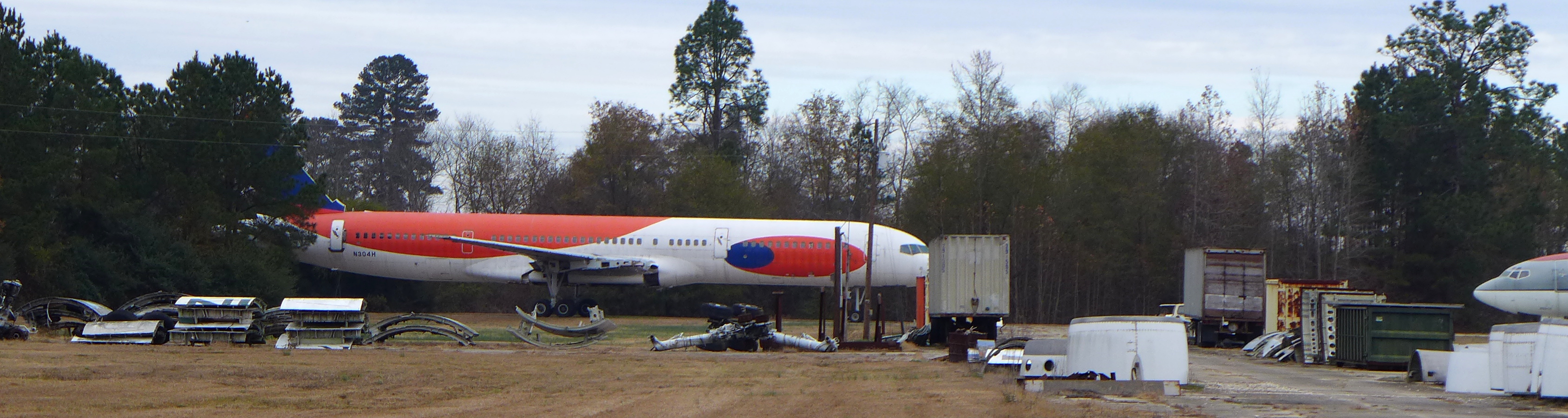 Lots of people visit South of the Border, although very few by bicycle. Almost no one visits the airliner junkyard at Laurinburg-Maxton airport. This is unfortunate, because these planes are fascinating to look at. They fly them in on their final journey, and then spend several years gradually taking them apart. Until recently there was no fence at all at the southwest corner, and you could bike right up to an enormous dead 747. There is a waist-high fence now, so I chose to be lawful and photograph from outside the fence.