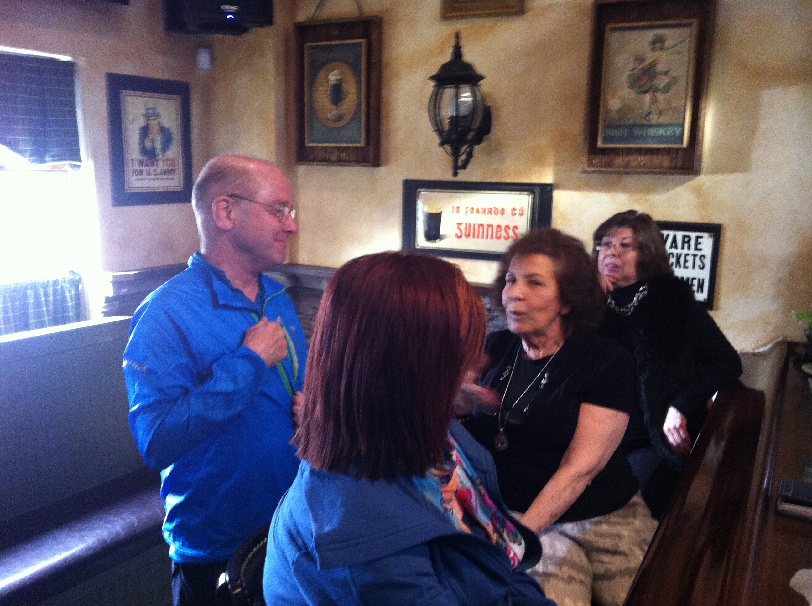 Over the next day and a half, what I can only call suburbia went on and on. We transitioned from the wealthy neighborhoods of the North Shore to more conventional middle class tract housing. Late the afternoon of the second day, we were sixty miles by car from Manhattan, and still really had not seen much undeveloped land;’ the sprawl continued. We stopped for a beer at an Irish bar in a strip mall near tattoo parlors and motorcyle shops. I spoke briefly to these women. All three were originally from Brooklyn, but say they hardly ever go back there now. They spoke of all the crime in Brooklyn. (photo by Lyman)