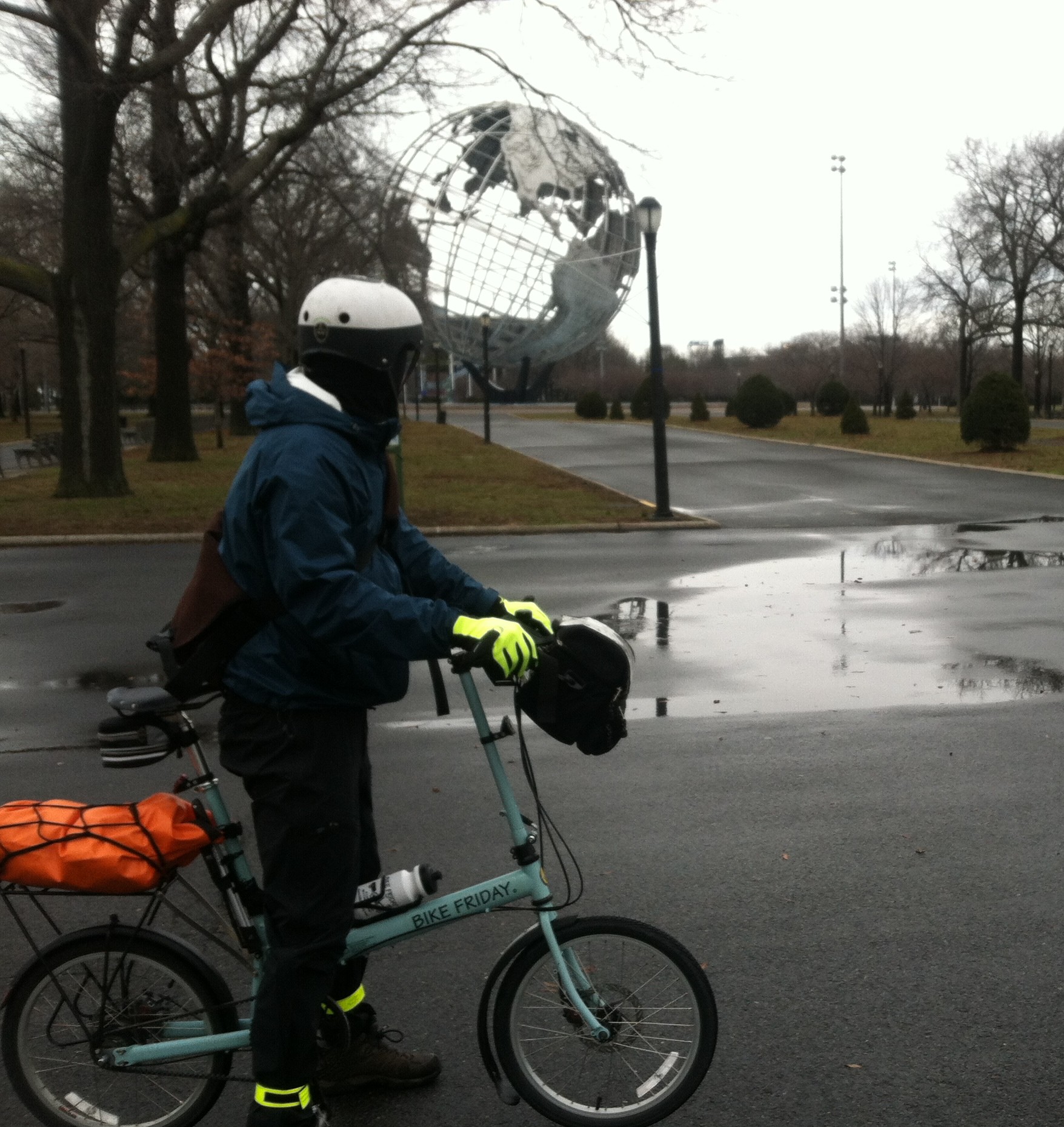 Lyman and I delayed starting our three day bike ride from Brooklyn to the eastern tip of Long Island because of weather: rainy, with temperatures in the thirties. We finally started Monday morning east of Brooklyn’s Prospect Park, with a prediction that the weather would clear by noon. A mix of drizzle and snow pelted us as we slogged through heavy traffic in the bike lane up Bedford Avenue, turning towards Queens in Williamsburg. Trucks would park in the bike lane every couple of blocks, and we would have to swerve out into the melee. It was a genuine good time.