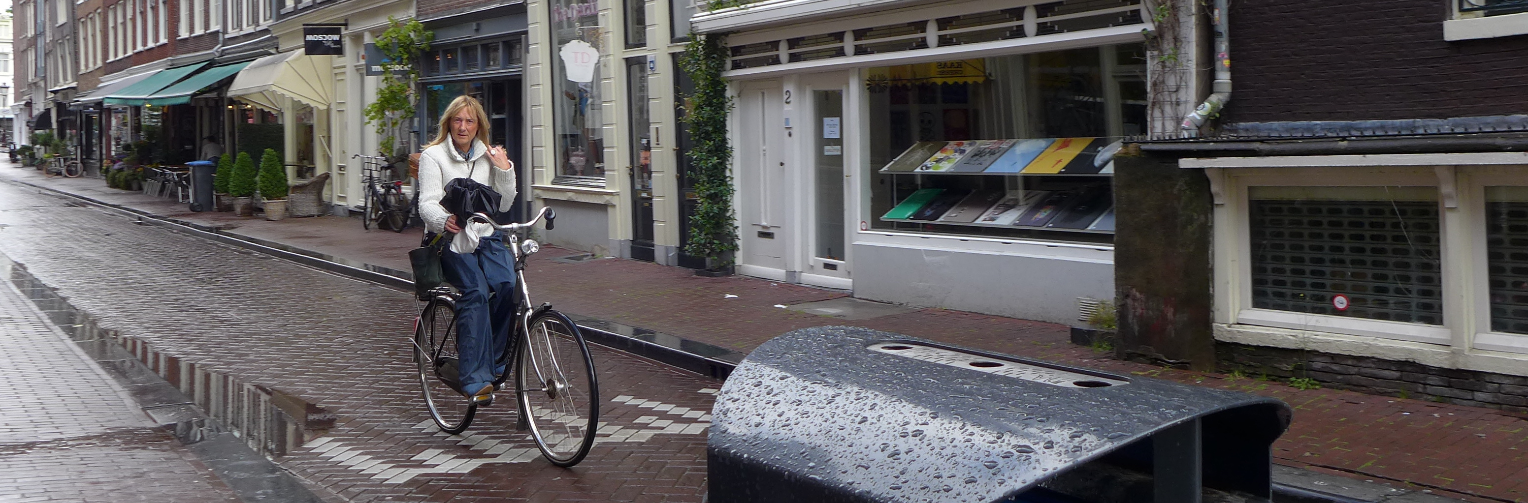 Friday night was in Gouda, as in the cheese. Saturday night was in Utrecht, as in the treaty of. Both are wonderful historic cities laced with canals. Sunday we rode mostly in the rain from Utrecht to downtown Amsterdam, where we stayed one night. As long as we kept moving, we did not get too cold, and hurried to dry off in our hotel, which we had booked the night before.