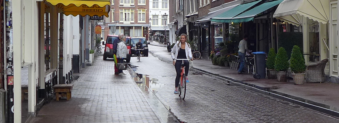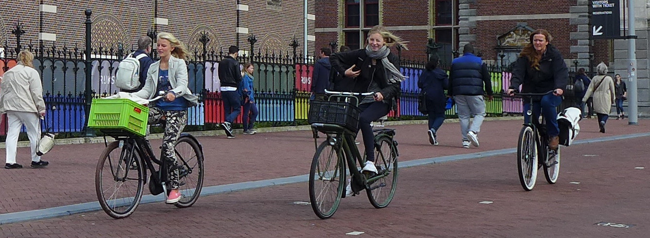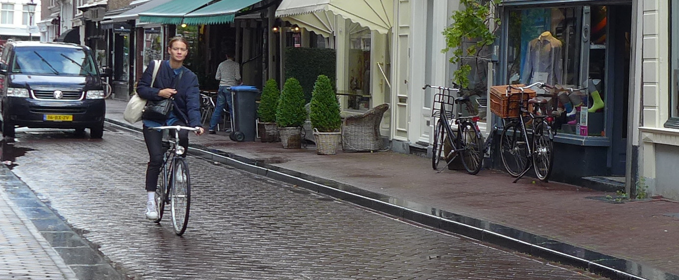 1. The weather is such that special clothing is almost never required to ride a bicycle. We were there in August, and most cyclists were wearing a second layer for warmth, like a jacket. Getting sweaty and having to change clothes or shower on arrival is essentially unknown. Most people would not put on athletic clothing to bicycle in the Netherlands any more than you would do so to drive a car. The only bicycle helmets we saw were with guys in spandex suits, training on racing bikes. Everyone else just wore their regular clothes. It does rain a lot in the Netherlands, but this frequently involves extended periods of gentle drizzle. Most Dutch seemed to just get wet. Cycling in the rain in the Netherlands is no worse than walking in the rain. We saw people cycling holding an umbrella. Almost all bicycles in the Netherlands have fenders to keep from getting splashed, and have covered chain rings to keep pants away from the chain.