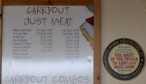 In this depressing working class side of Lakeland I ducked into BubbaQue’s, lodged in a strip mall next to a gun store. They wear their political opinions here openly, posting this next to the takeout menu.