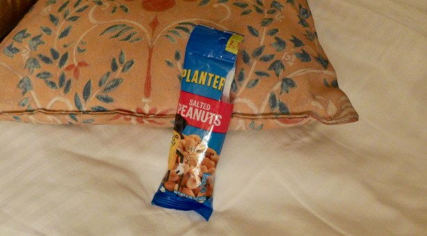 I obviously was still hungry but certainly I was not going to spend any more money at that place. I went back to the hotel room and made in-room decaf coffee accompanied by the items on hand in the front bag of my bicycle; a Powerbar and the best deal of the night, a fifty-nine cent bag of peanuts.