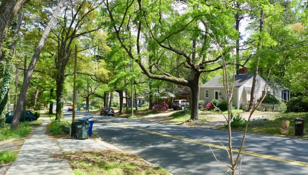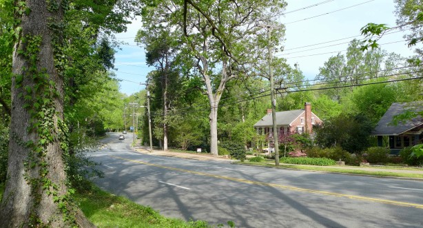 There is a sidewalk on both sides of Franklin Street has it winds through a leafy neighborhood before suddenly heading steeply downhill, off the “hill” Chapel Hill was originally built on.