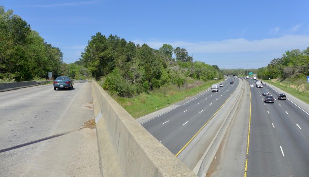 For the next mile or two I had to walk on the highway facing traffic, but step off into the grass whenever a car came, which was about a third of the time spent walking. Old Chapel Hill Road crosses over I-40. This was the view looking back.