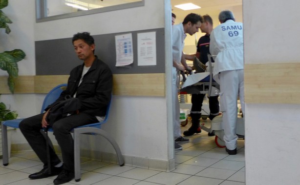 Inside, it looked a lot like a small hospital in the USA, except maybe a little rattier. You walk in a small dated looking lobby, and there is a window with a couple of receptionists. You talk to them a while, they take down some information, then the automatic doors open, and you walk to another counter where a nurse briefly checked out my condition and took my blood pressure. He directed me through another set of double doors, point to a small waiting room, and said something in French meaning Wait Here. Lyman and I sat there many many hours.