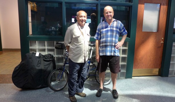 The two and a half hour Amtrak ride into New York City was a breeze. At the Albany station, I ran into two bicycle people; Paul Winkeller, Executive Director of New York Bicycling Coalition; and Harvey Botzman, an author from Rochester NY. Ten years older than me, Harvey has been doing the kind of bicycle touring I have been doing, but more or less full time, for over twelve years. He has bicycled around all of the Great Lakes, some several times each. His folding Bike Friday is in the black case on the left. He rode with me on the train and we had lots of time to compare notes.