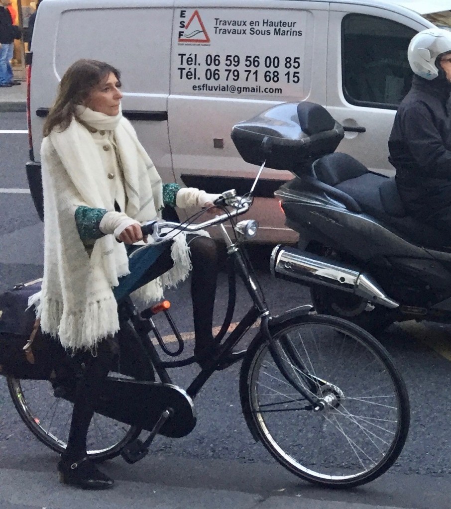 I wanted to photograph stylish women in Paris riding bicycles, but they were almost always faster than me and it was hard to bicycle while also trying to take photographs. Lyman finally took this picture at a stoplight. She is riding an elegant Dutch style bicycle, but on the streets of Paris one sees all kinds of bicycles.