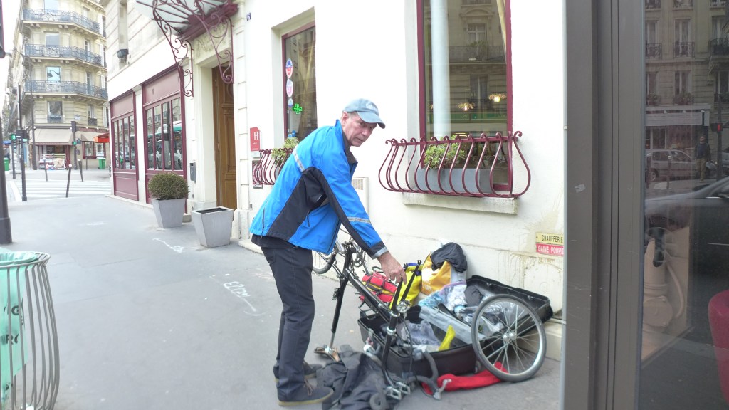 Arriving from the airport about eleven in the morning to the Luxembourg neighborhood of central Paris, we lugged our suitcases up the stairs to the street. Near the hotel and alongside a sushi restaurant Lyman claimed a spot of sidewalk to put his bicycle together.