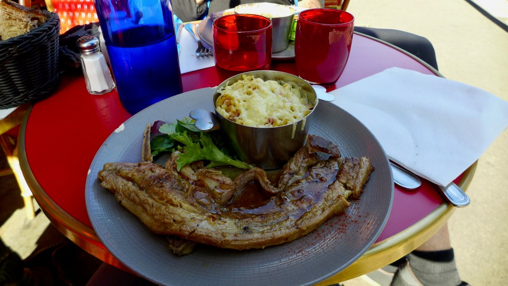 We stopped for lunch at a place we found pretty much at random and ate outside. Being France, it was, of course, delicious. Veal chops and something like macaroni and cheese.