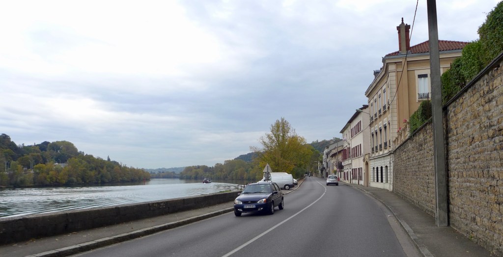 The hotel had insisted we store the bicycles down a steep flight of stairs in their basement. We lugged the bicycles back up the stairs and hit the streets. Lyon is at the conjunction of the Saone and Rhone rivers. We were going to bicycle up the Saone for at least a few days. It was only a couple of blocks from the hotel to the Saone river. We biked across the bridge and made a right turn, heading north.