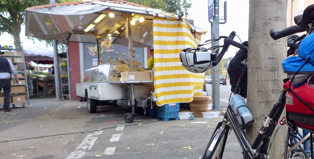 In a strip mall along the trail we found a kind of gourmet shop to buy pate, cheese, and wine. Next door was a bakery. We carried the supplies on the bicycle for a while.