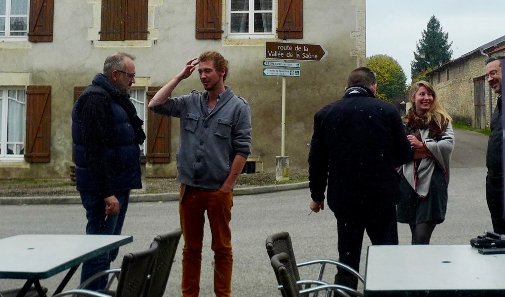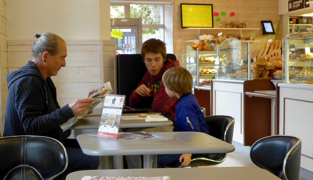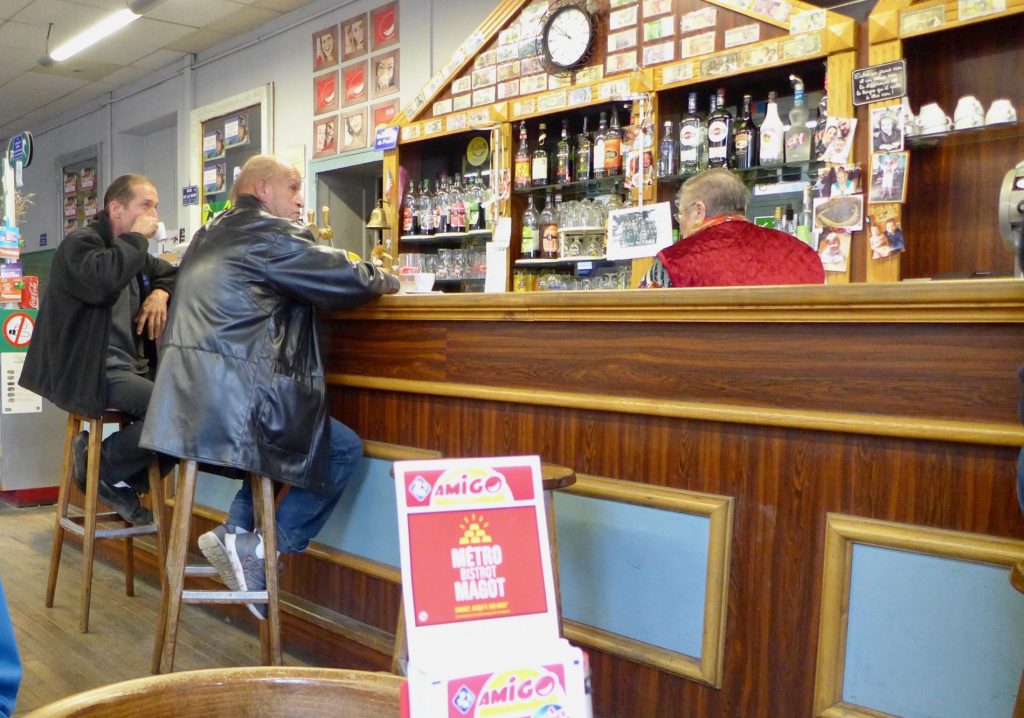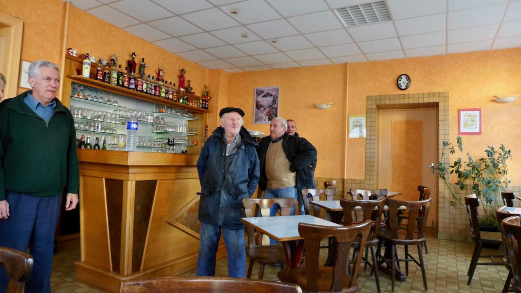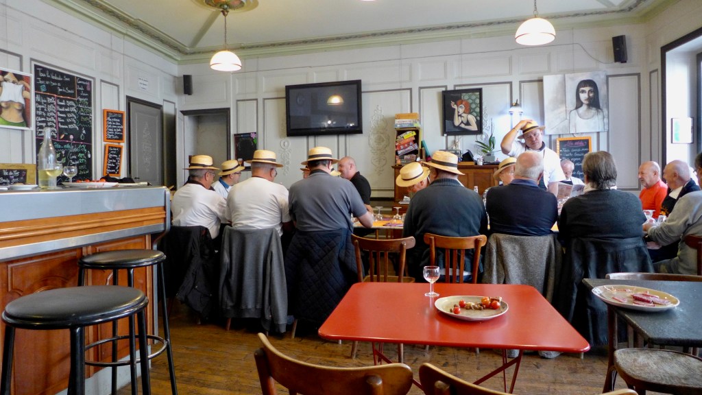 The young woman running the bar somehow found time to talk to Lyman and me and helpfully suggested we walk around the corner and buy croissants. She would make us two cafe au lait to be ready when we got back. Meanwhile, she and a couple helpers were making some kind of complicated heavy meal for all these guys, who were were starting to put distinctive hats on.