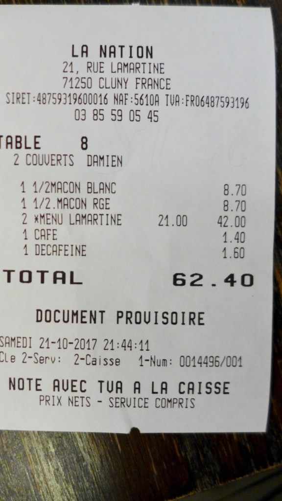 Note that the portions were helpfully not all that large. We had an excellent food experience without being overwhelmed. In France one normally does not tip, so at 1.18 to the dollar this comes out to about $ 73.00 including tax and tip, and also including two half liter carafes of wine, one each of the red and white house wine of the region (Macon).