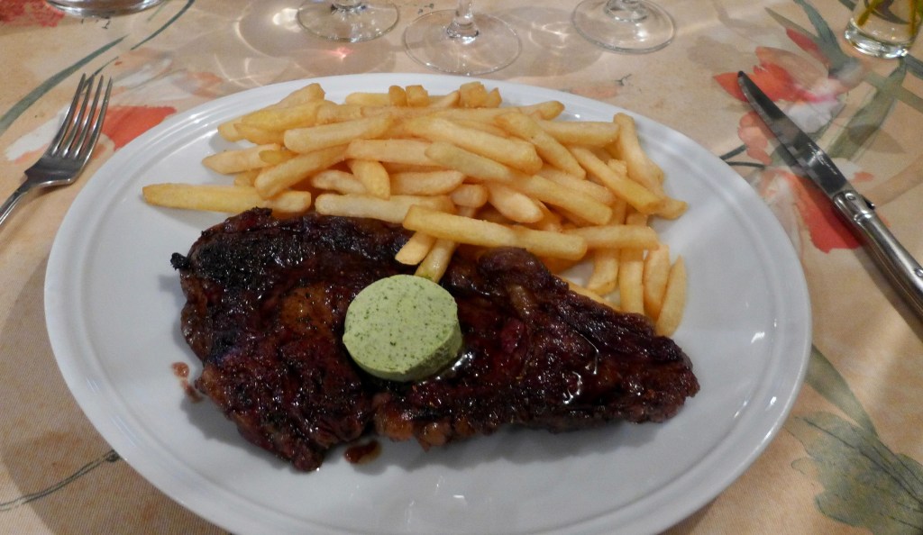 Second course was the best steak I remember ever eating; artfully burned on the outside, medium rare “au point” on the inside, with a dollop of herb butter on top, the plate sizzling hot.