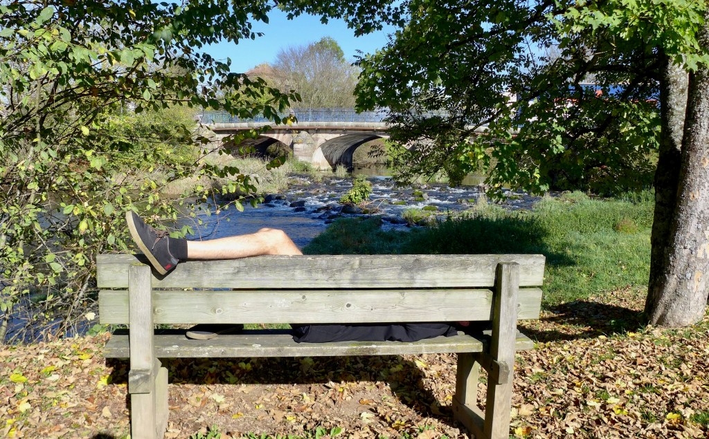 Ronchamps, the town that we had thought of an our intermediate Holy Grail, lay just thirty-something miles down the road. We stopped on the way for a picnic lunch at a bench overlooking a stream. Lyman took his customary catnap.