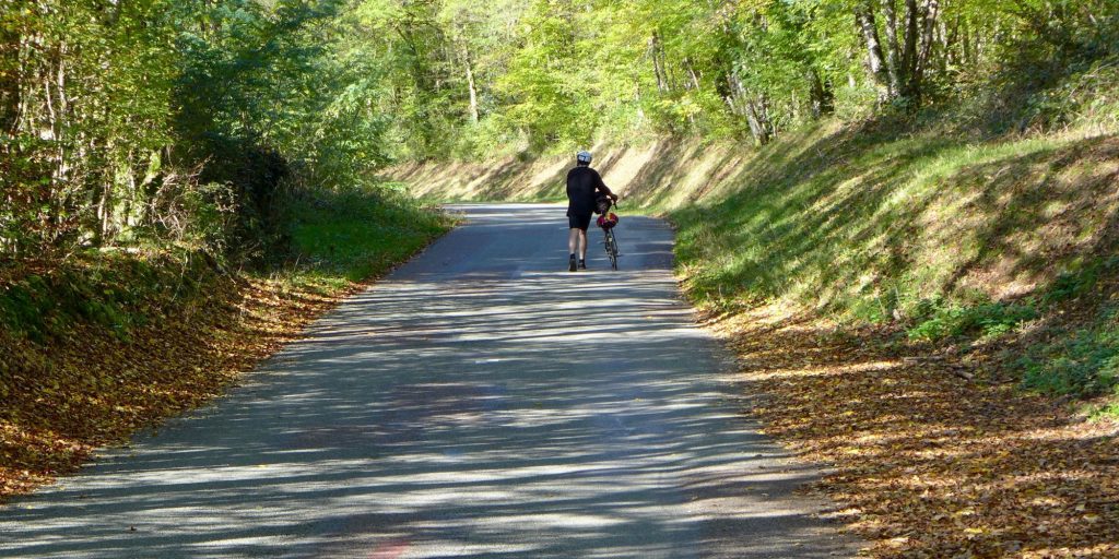 We cycled away into the Saturday morning. We followed the river north for a while, but just before the small city of Macon there was a black line on Google Maps, indicating some kind of trail or bike path. We would have to check it out. We discovered one of the nicest rail-to-trails that I have ever seen. The Voie Vert (Green Route) was beautifully paved and extended over fifty miles on a former rail line as it wound into the small mountains that line the Saone river valley, all the way from Macon to Chalon-sur-Saone. We would cycle this trail partly this day and partly the next. Frequently there were vineyards on both sides of the trail.