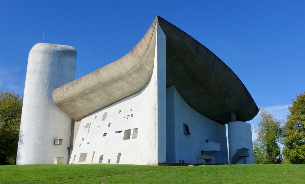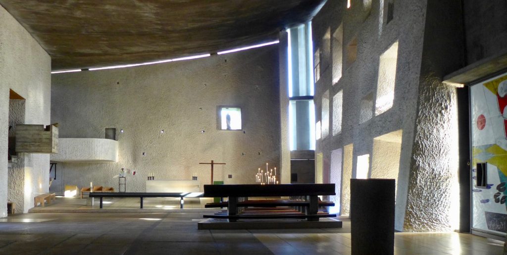 The church in question was built in 1954 and designed by the French/Swiss architect who had pretentiously changed his name to Le Corbusier. Le Corbusier is better known for his now-discredited 1920’s ideas of tearing down urban centers and replacing them with Towers in the Park.
