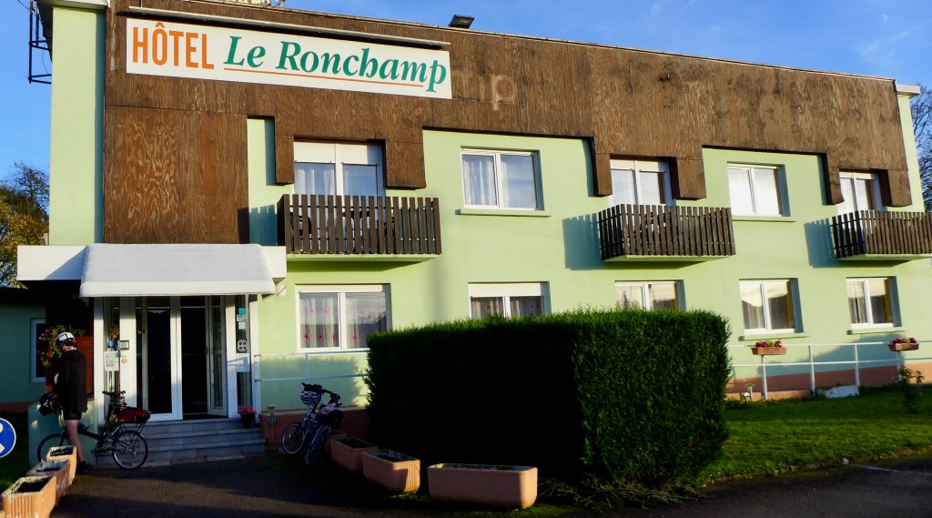 Quite impressive, and we walked around for an hour or two, and bought souvenirs at the gift shop. Back downhill in the town of Ronchamp we looked for somewhere to stay. There is only one real hotel in Ronchamp. It all sounded fine online but in reality it was closed and locked. I called their phone and left a message in fractured French.
