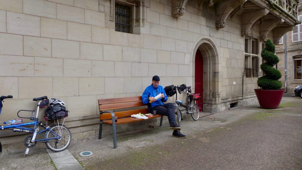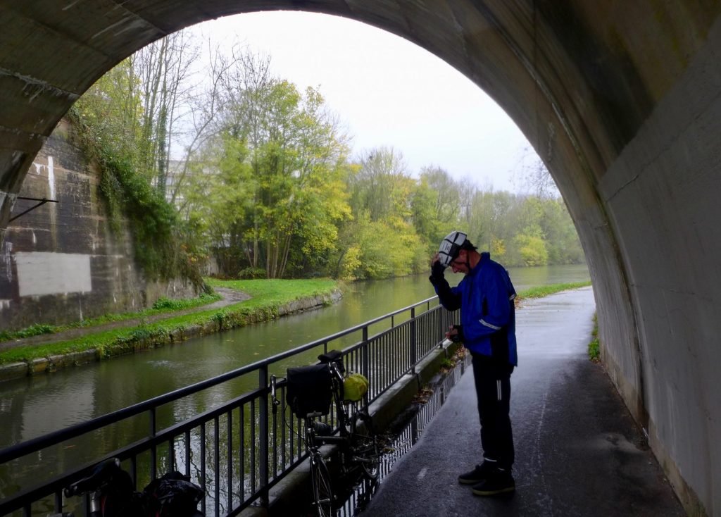 Sunday morning the temperatures were in the low forties, not actually raining but the air was heavy with moisture. The weather would not respond to the question: is it going to rain or not? Our intermediate destination was the relatively large city of Nancy. We got wet gradually, mile by mile, cycling hard to keep from freezing, on a combination of backroads and canal paths.