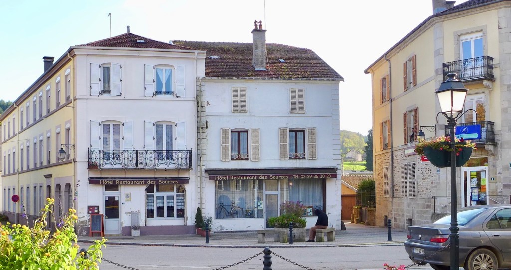 Google maps had shown several hotels in the town of Bains-les-Bains and we struggled uphill to get there. On the surface the town looked pleasant. It clearly had been some kind of spa town. We learned that the “Bain Romain” in the center of this photo is locked and essentially abandoned.