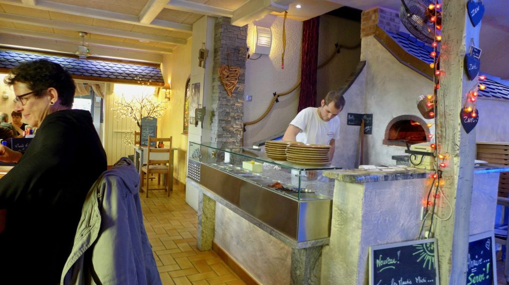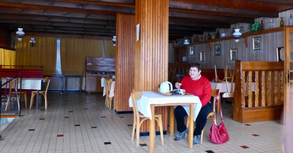 We still had to eat somewhere. While Google showed three or four “restaurants” in Ronchamp, two were closed and boarded up, and one was a kebab joint, brightly lit with hardly any seating. Restaurant Cook advertises itself as a pizza place, but it is really a French restaurant, except that you can order pizza or spaghetti if you like. We saw this Italian trend with many lower cost restaurants all over this part of France. The food we ordered was French and delicious. I think I got lamb chops. A family behind us had very well-behaved children, sitting in front of the wallpaper depicting Italy.