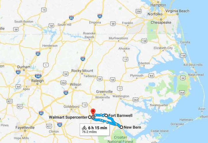 We enjoyed it so much that I drove back by myself two days later to take a bike ride. Eastern North Carolina is called Down East, a vast flat coastal plain in some places as much as two hundred miles wide. It is the poorest part of North Carolina. Some towns like Kinston seem far away from “anything.” Kinston is not near Raleigh or Charlotte or Wilmington, not even all that close to the beach. New Bern is almost the oldest town in North Carolina and has long been a draw as a historic place. I decided to bike from the Walmart near Kinston to New Bern and back, on two consecutive days.