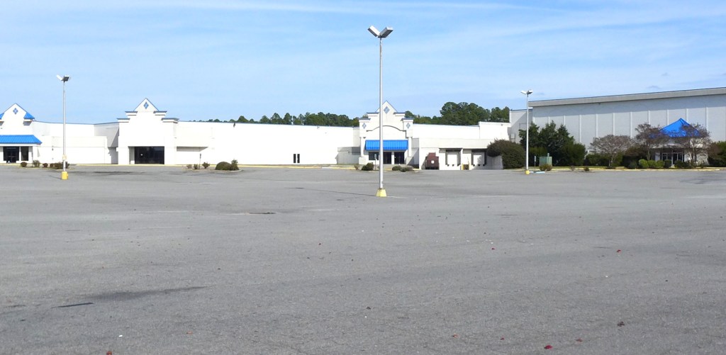 The Walmart and other large chain stores in this newer strip mall out near the Bypass have clearly taken their toll on older sprawl closer, maybe only a mile or two from downtown. The Kinston Mall, on this Saturday afternoon, was essentially abandoned.