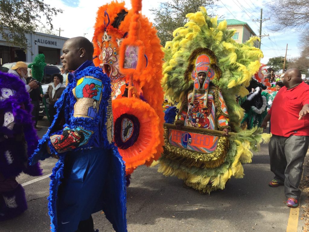 One of the most mysterious parts of Fat Tuesday is the Mardi Gras Indians, African-Americans who dress up like American-Indians. Supposedly they do not actually “parade; ” they just appear, usually in poor African-American neighborhoods, unannounced, to do symbolic battle against other “tribes” of “Indians.” The Indians are men that have spent a year or more sewing their own costumes.