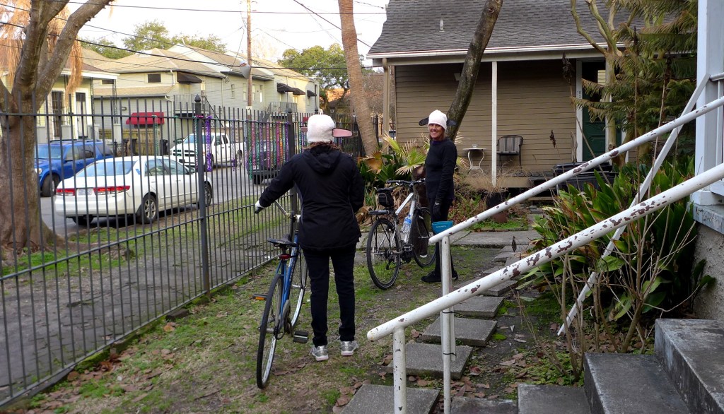 We had three bicycles, two of which our friend graciously allows us to store permanently in New Orleans under her house. Mardi Gras beads were draped over her fence.