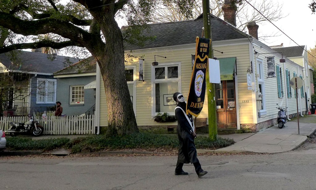 Driving a car in the city on Fat Tuesday is pretty much impossible so a bicycle can be quite handy. We were staying in our friend’s upstairs guest apartment near Louisiana Avenue and Magazine Street. It was 6:15 AM as we put on the sheep outfits that Tootie had designed and constructed.