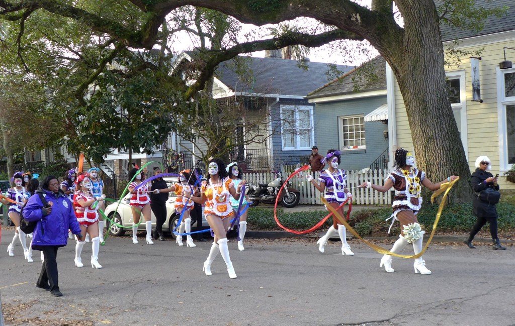 On our way bicycling to The Hood we passed through the much wealthier Garden District where at 6:45 AM we stumbled onto this impromptu appearance of the New Orleans Baby Doll Ladies; already dancing through the cool morning, accompanied by a loud and raucous brass band.