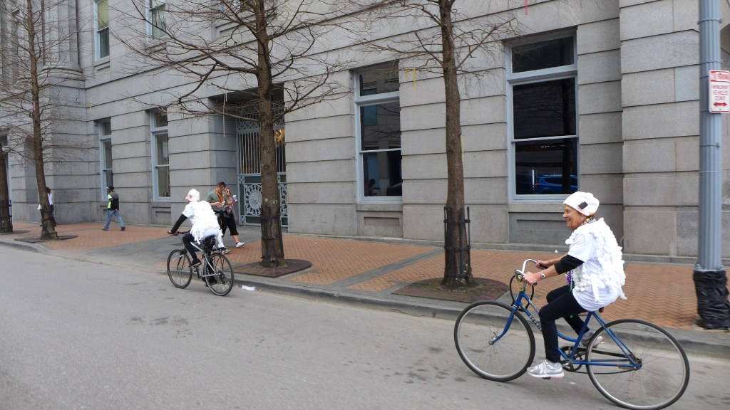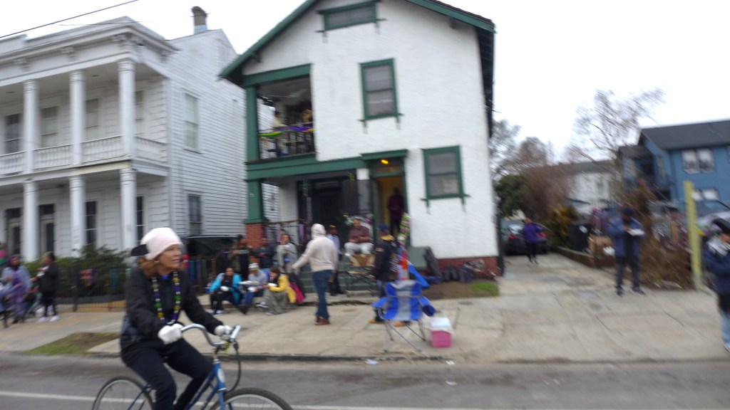 We crossed St. Charles Avenue and bicycled on into neighborhoods areas I have hardly ever visited. I had felt scared to go in these African-American neighborhoods but it all seemed welcoming on Mardi Gras morning. At 7:15 AM I followed Tootie and Kathryn up Jackson Avenue as people were staking out their spot to watch the Zulu parade.
