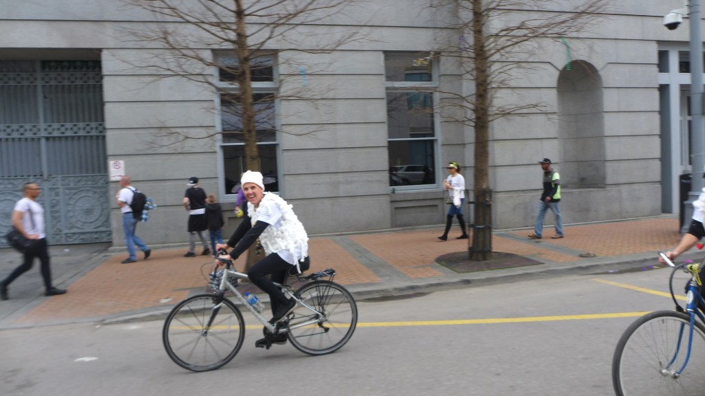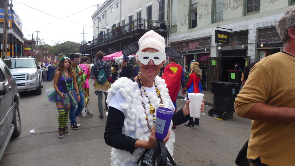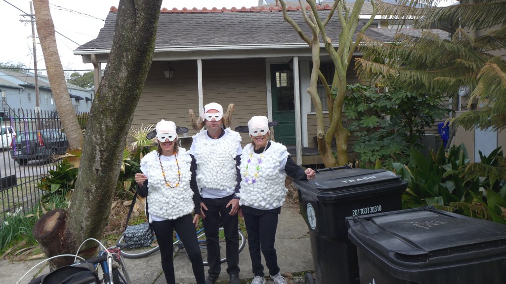 All was great except we had two problems. We did not see Mardi Gras Indians anywhere, and both Tootie and Kathryn felt somehow incomplete without an entire Sheep costume. We hurriedly biked back to the apartment to put on the full costume.