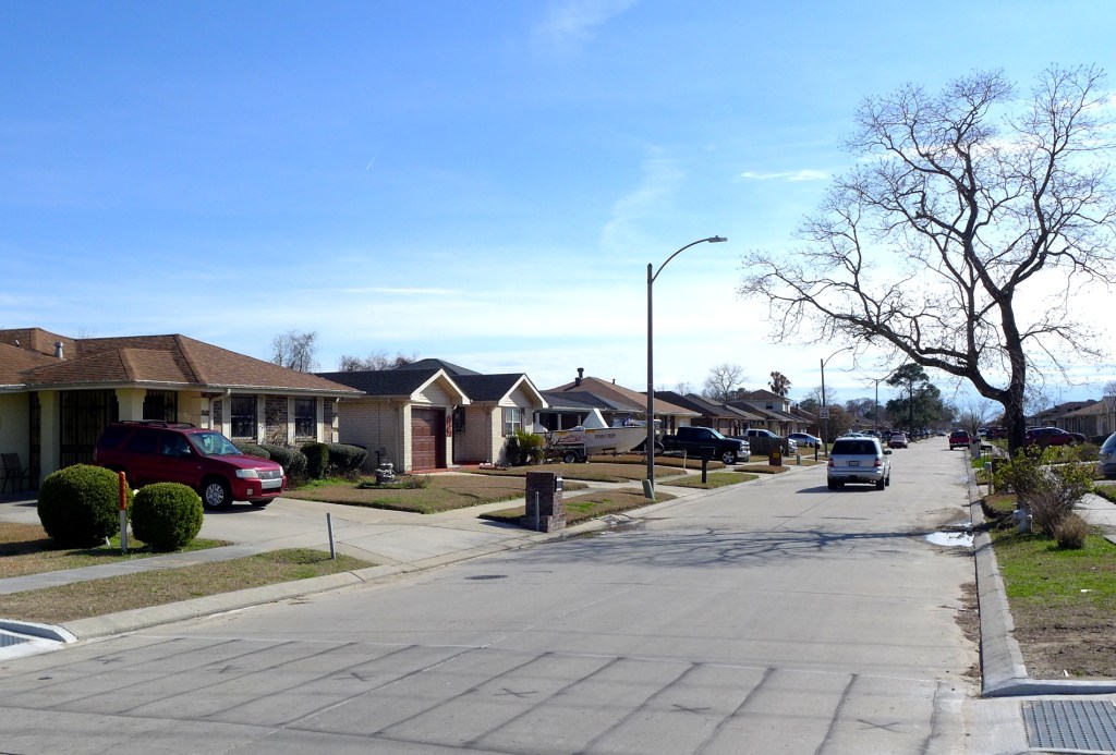 I knew I was getting close to my destination, the amusement park, so I turned north across the railroad tracks, into residential neighborhoods of New Orleans East. This area was first developed in the sixties and seventies and was mostly white. Now it is where many wealthier African-Americans live. According to Wikipedia, both Aaron Neville and Irma Thomas live out here somewhere.