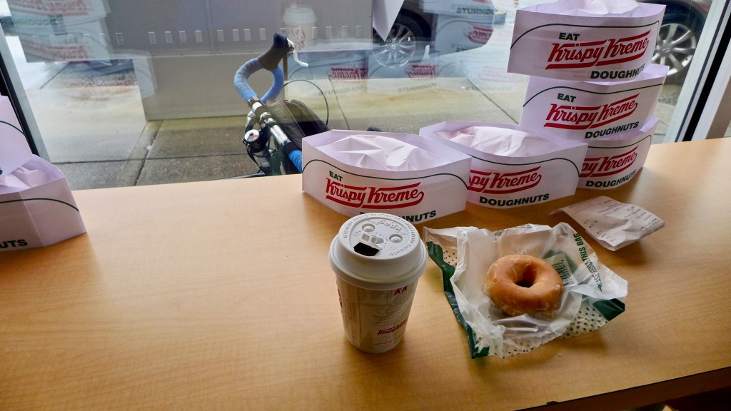 I could say that I spent the next day looking around the interesting parts of Columbia, maybe finding Columbia College or my parents old neighborhood, wherever that was. Or maybe exploring early 20th century residential neighborhoods like Shandon. But I did not. Cloudy skies were predicted but the reality was a cold rain. It rained quite hard that morning; when it stopped briefly I had no choice other than to get on the bike and start riding west back toward Batesburg-Leesville. After about six miles the rain started up again and I ducked into a Krispy Kreme doughnut store. I sat there quite a while, eating my doughnut and drinking my decaf coffee, watching the West Columbia world go by.
