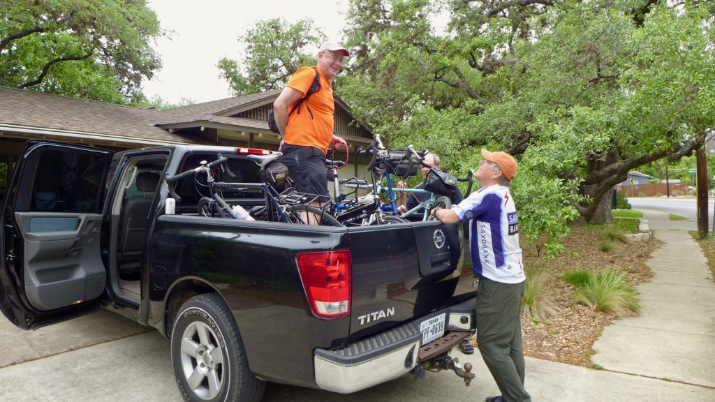 We met on a Thursday morning at Lyman and his partner Gillian’s Austin, Texas home. Befitting a trip in Texas, Jorgen showed up from his home in the Houston Heights with a huge four-door pickup truck. We could easily pile all four bicycles in the back.