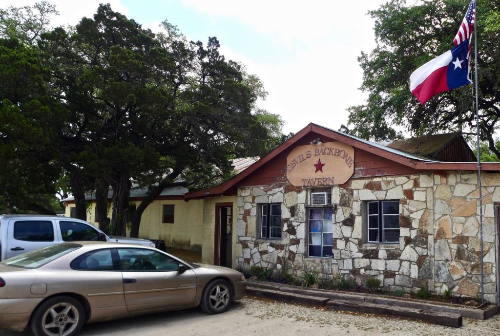We drove southwest about eighty miles to a spot called Devil’s Backbone. I do not know any parallel in the Eastern USA to the Texas and Western tradition of a bar sitting uniquely and somewhat forlornly by itself on a two lane highway, far from any town. I guess you could call it a roadhouse. This watering hole, named after the rock formation it sits on, has been here since the 1940’s and had a big Texas flag.