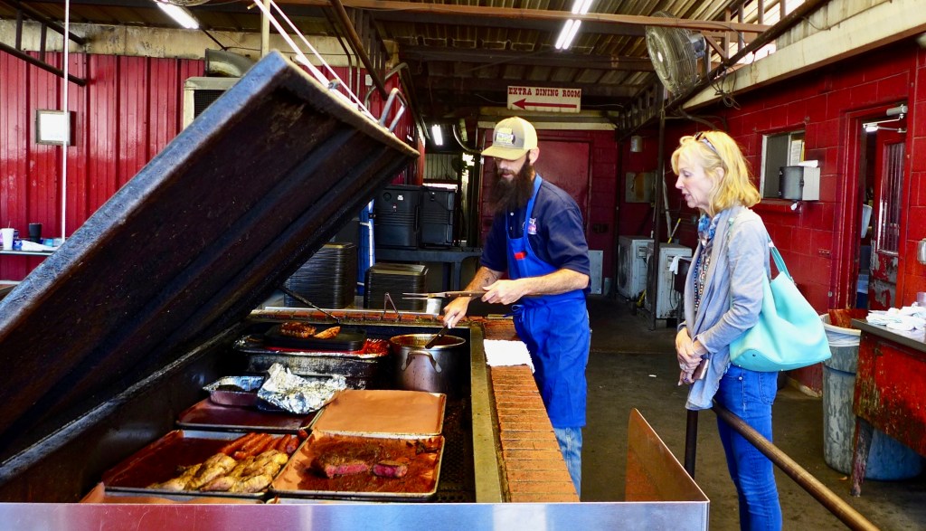 That pretty much was the end of the bicycling on this trip. That afternoon we piled the bicycles in the truck and drove about forty miles north, just to be able to eat at the fabled barbecue restaurant Cooper’s in the town of Llano. Even though we arrived at what normally (to me) would be a “dead” hour, 4:00 PM, it was still packed on a Saturday afternoon. The restaurant is on the main highway going out of town, the lot was jammed with mostly pickup trucks. To be able to enter a patron first passes by a grill covered with several kinds of meat, where you can select your slab, paid for by the pound. The tables inside had unlimited sides of Sunbeam style white bread and ranch beans. It was all quite delicious, although I was not in much in the mood for meat for quite a few days after this.