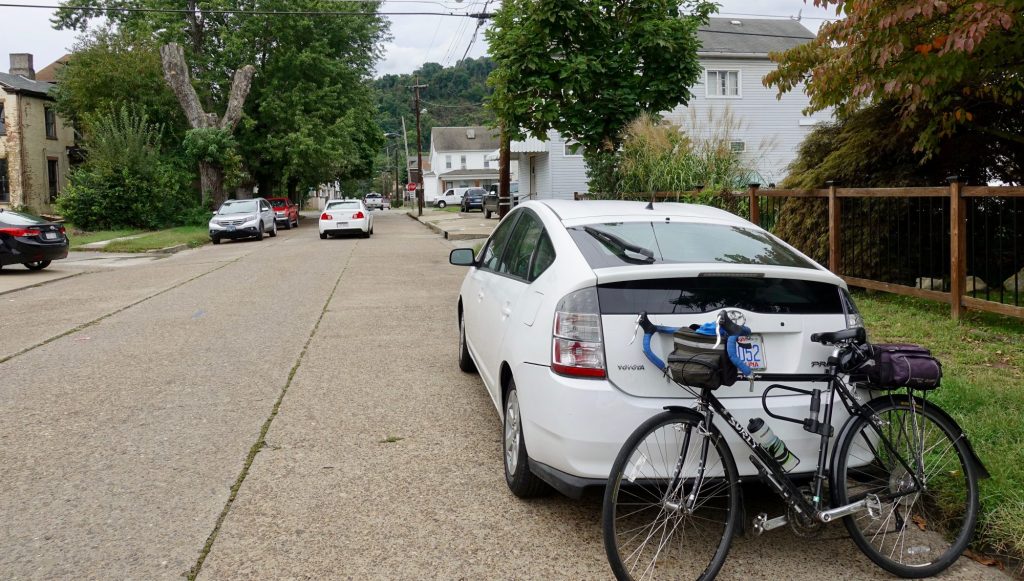 The young woman at Enterprise in downtown Pittsburgh was helpful. Wheeling WV must not have a great reputation around here as she snickered when I said where I was going. She helpfully and for no extra charge gave me a minivan so I would not have to take the bicycle apart.