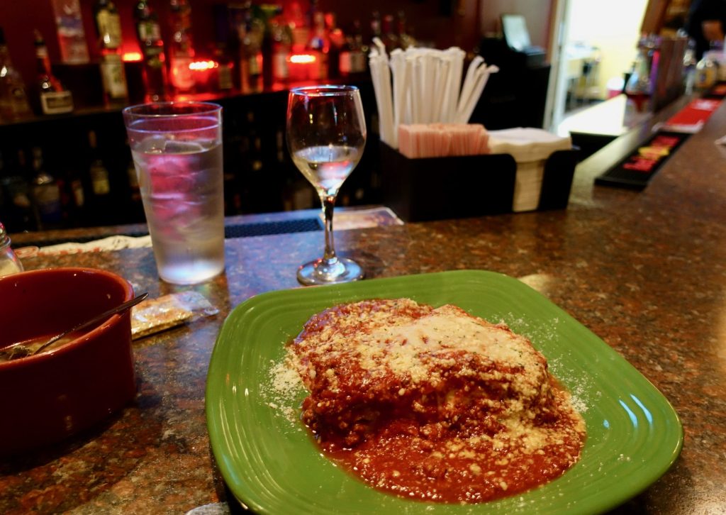 One key difference between Steubenville and my usual part of America is the price. The lasagna for $ 9.95 includes first course choice of soup or salad; the wedding soup seemed homemade. Wine is $ 5.50 a glass.