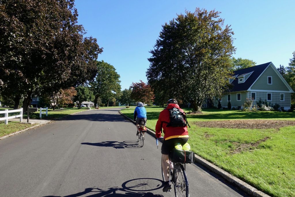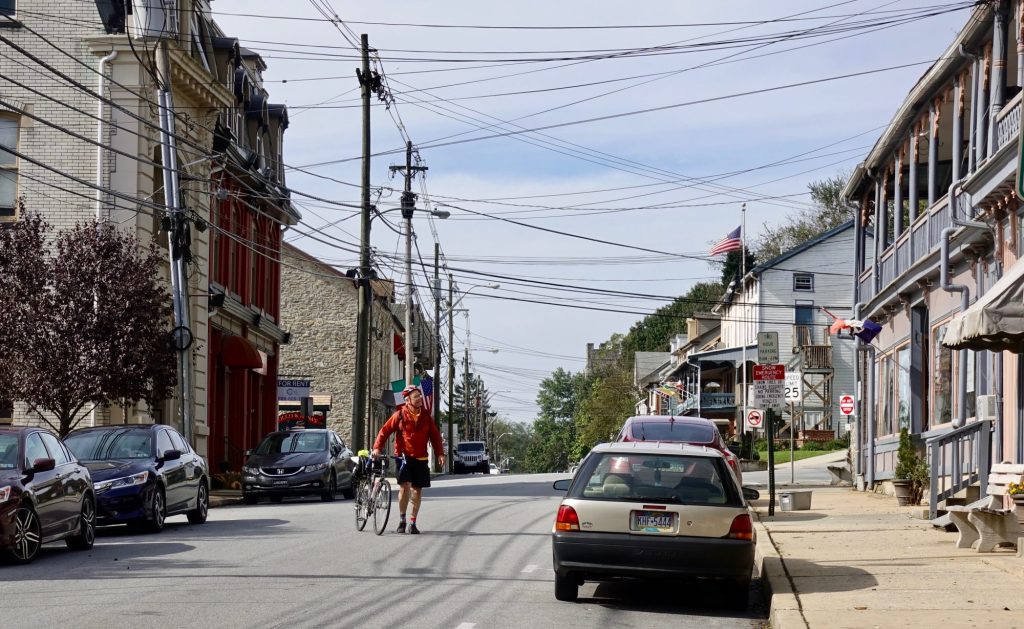 We prepared to push off. Our destination this day would be Lancaster PA. In the backyard of our Airbnb in York Connie was doing some warmup exercises.